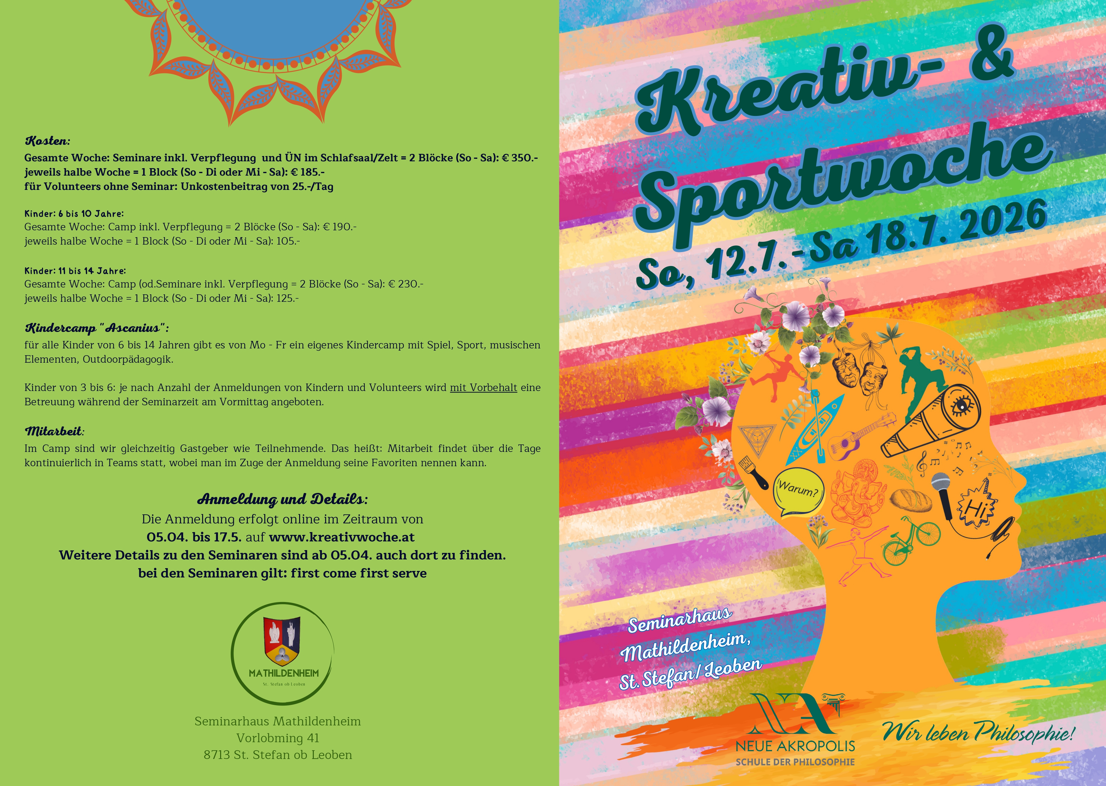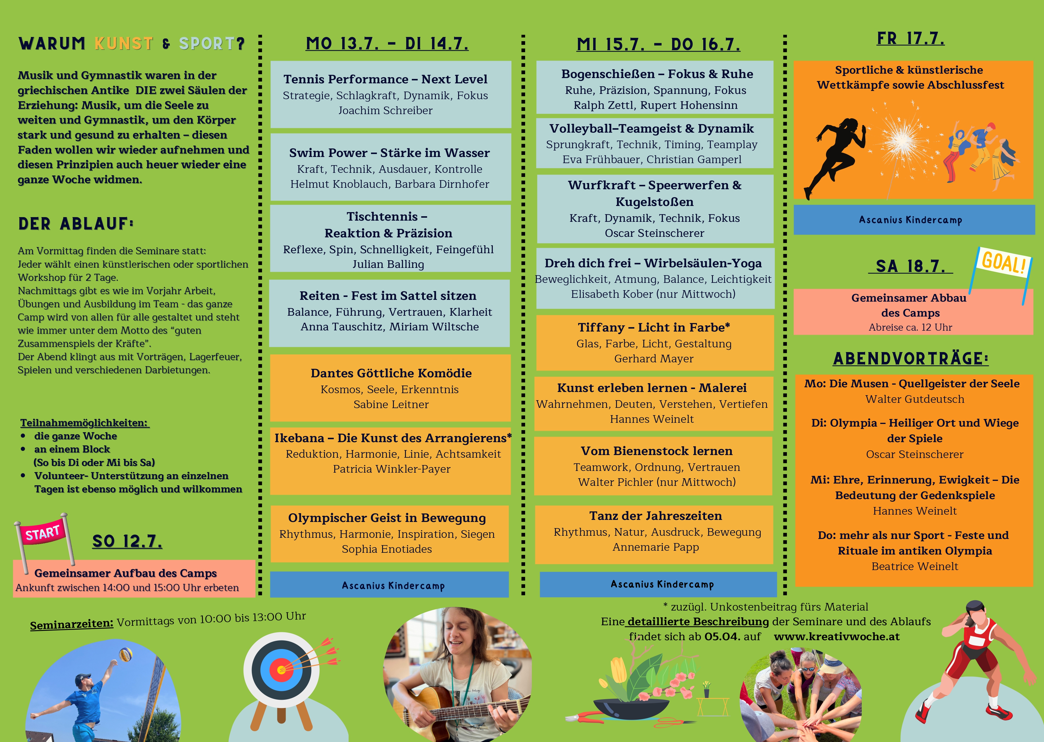 Philosophie, Kreativität, Bewegung, Freundschaft – auch heuer gibt es die Gelegenheit, auszutauchen aus dem Alltag und einzutauchen in eine andere Welt, verschiedene Fertigkeiten und in eine legendäre Gemeinschaft.